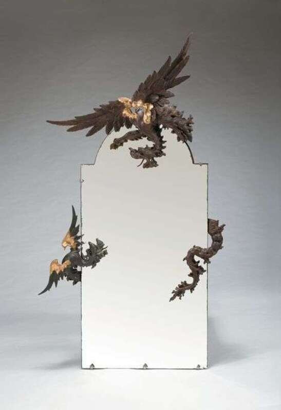 The arched and beveled glass plate mounted with two carved and parcel gilt fighting dragons. H: 66, W: 36 in.