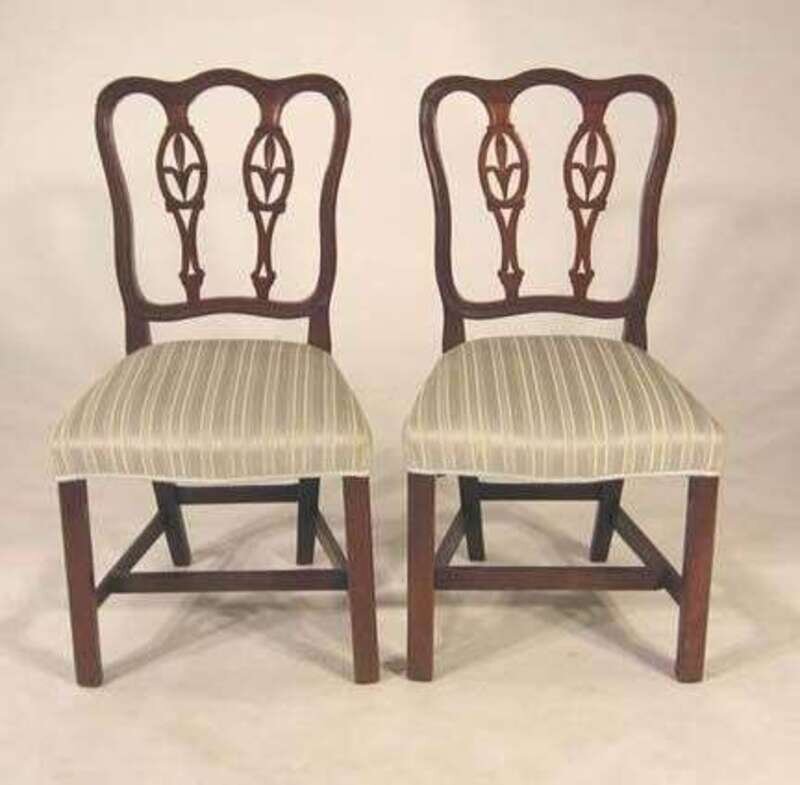 The shaped backs with twin pierced carved splats, the overstuffed upholstered seats on square legs joined by an H-form stretcher.