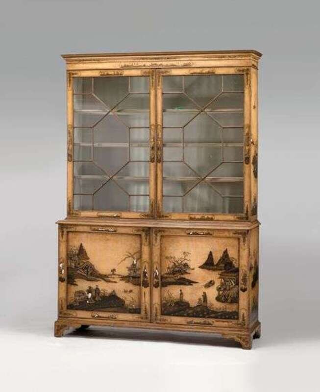 The japanning later, with chinoiserie decoration throughout, the cavetto molded cornice above two astragal glazed doors, enclosing a shelved interior, the lower section with two cupboard doors raised on bracket feet.
