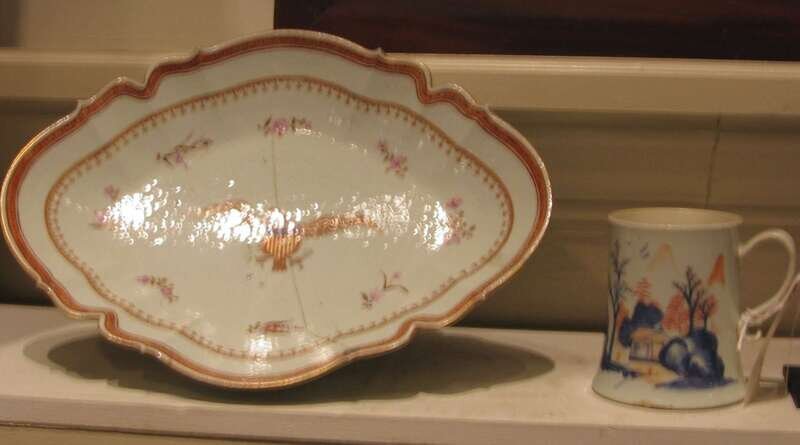 Including an oblong footed serving dish decorated with an American Eagle with shield and bannerette inscribed "E. Pluribus Unum" and a mug decorated with a landscape in red and underglaze blue heightened with gilt.