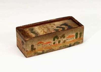 The rectangular box with sliding cover painted yellow and decorated with buildings and trees in green, pumpkin and cream.