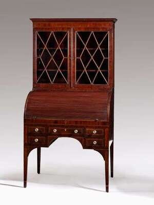 The molded cornice with contrasting inlay above two glazed doors with mullions , the lower case with cylinder tambour desk opening to a fitted interior with maple-faced drawers and pigeonholes and pull-out lined writing surface, above arrangement of five drawers and tombstone-inlaid tapering legs, line-inlaid throughout.