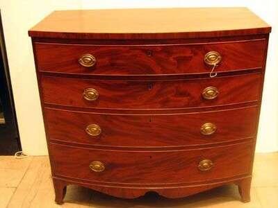 Having a swell front with graduated wide cockbeaded drawers on French bracket feet.