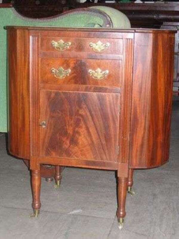 Having a rectangular top with paneled lift lid end compartments, one fitted and one plain drawer below, reeded pilasters on turned feet.