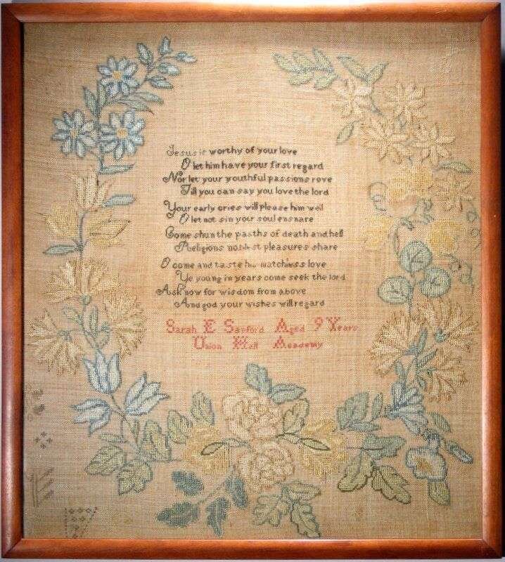 Needlework sampler sarah e. sanford aged 9 years union hall academy, new york