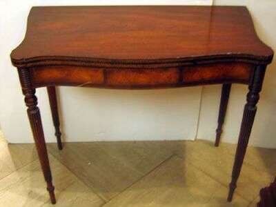 Sheraton-style with serpentine inlaid edge top and apron, outset corners, on reeded round legs, tall turned feet.