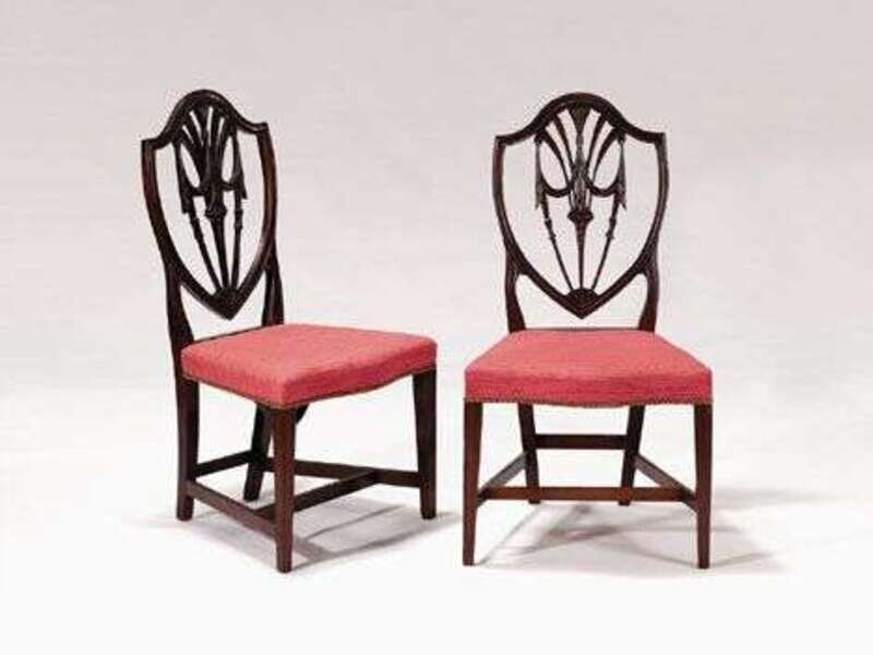 Having shield backs with pierced and carved splats, upholstered serpentine front seats on square molded, tapering legs with "H" stretchers.