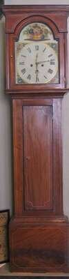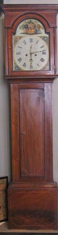 The molded cornice above tombstone-shaped glazed door and painted metal faced decorated with a basket with flowers, inlaid waist door, plinth base.