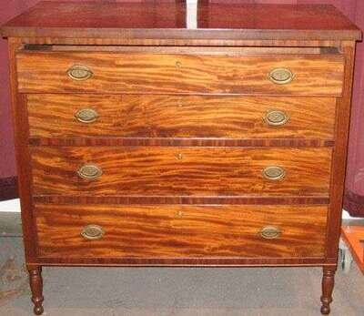 Rectangular top above graduated beaded drawers within fluted stiles, paneled sides, turned feet.
