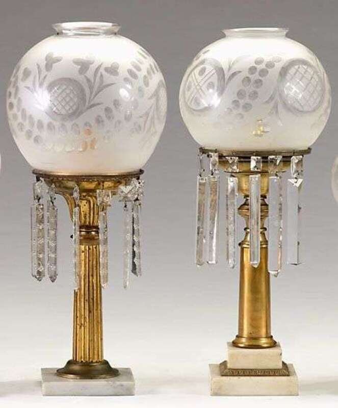 Each of tapering columnar form, one fluted, with glass globes etched with vines and cross-hatched and dot-filled circles, on marble plinths, with lustres.