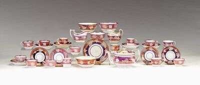 Including two creamers, teapot, three coffee canns, ten coffee cups, fifteen saucers, four bowls and a large shallow bowl in variations of an ivy and grape pattern.