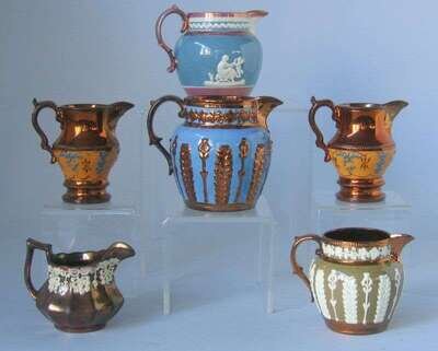 Six Staffordshire molded copper lustre milk jugs and creamers england, circa 1830