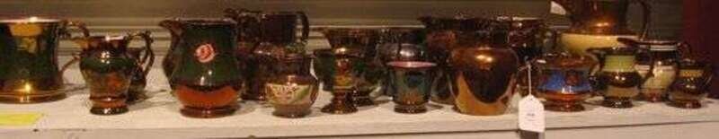 Includes 32 items, some solid copper lustre, others banded in green, blue, orange, and white, various forms and embellishments: four pitchers, eighteen milk jugs or creamers, goblet, double handled dish, small mug, four footed bowls oversize mug and a three-handled mug.