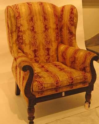 The upholstered arched back, shaped wings above scrolled arms with acanthus carved ends, baluster-turned legs, on casters.