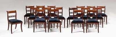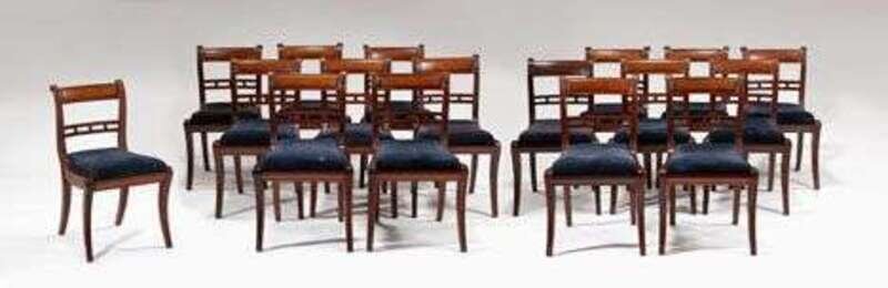 Including a set of fourteen chairs and three associated chairs, each with tablet crest centering figured mahogany panel flanked by backscrolling stiles above two molded splats joined by three spherules, slip seats, molded legs and seat rails.