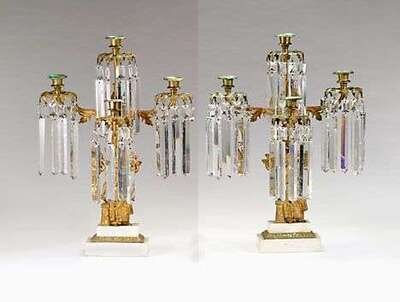 Each with three candle arms, cast in the figure of a near Eastern turbanned man standing before a flowering tree, on a stepped marble plinth, with lustres.