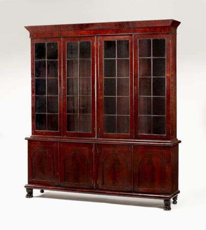 The molded cornice above four glazed doors enclosing shelves, the molded waist over four tombstone-shaped paneled doors and lion paw feet.