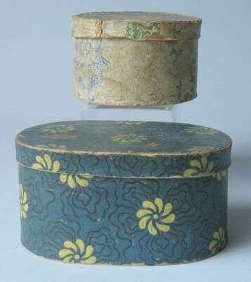 Including an oval box partially lined with newsprint from Lebanon, Pennsylvania, dated 1838, and a rounded box lined with newsprint of the Daily Transcript, July of 1862, and inscribed in pencil "Alice Erb aged 16."