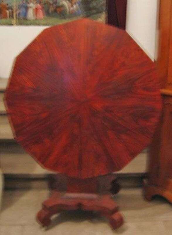 The polygonal top on tapering squared support, shaped platform and scrolled feet, painted in flame mahogany graining.