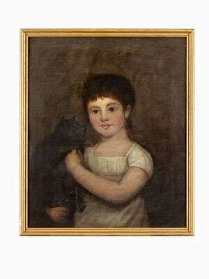 American School 19th century portrait of a young girl with a black cat