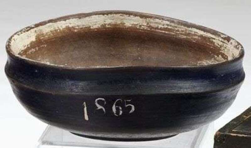 The bowl painted dark cobalt blue on exterior and worn white paint on interior and dated in white, the box with sliding lid painted dark green with fitted interior dated 1863 and initialed MODO.