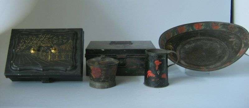 Including two spice boxes fitted with individual containers; one with stenciled on lid, other marked with makers name, "Freis", together with two tinware oval bread trays, a covered sugar bowl and a mug, variously decorated.