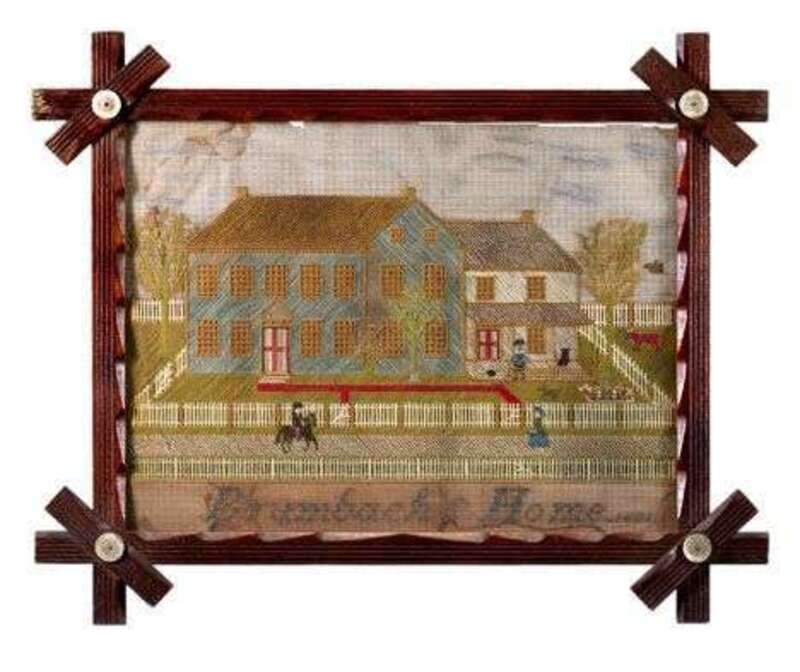 Worked with colorful wool yarns in shades of blue, green, gold, yellow and white and heightened with colored pencil, original frame.