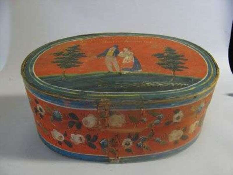 Of oval form painted red with blue and yellow striping, the side decorated with polychrome floral band, the top with courting couple flanked by trees under a German inscription.
