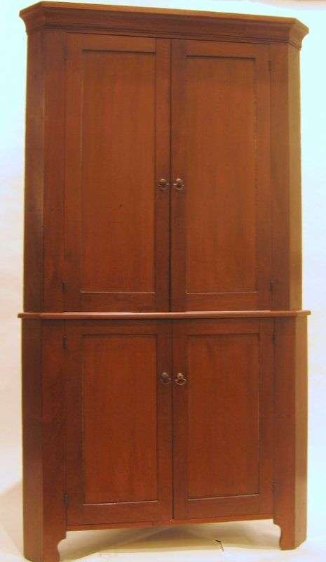 In two parts, the molded cornice above two recessed paneled doors, the lower section with corresponding paneled doors, bracket base.
