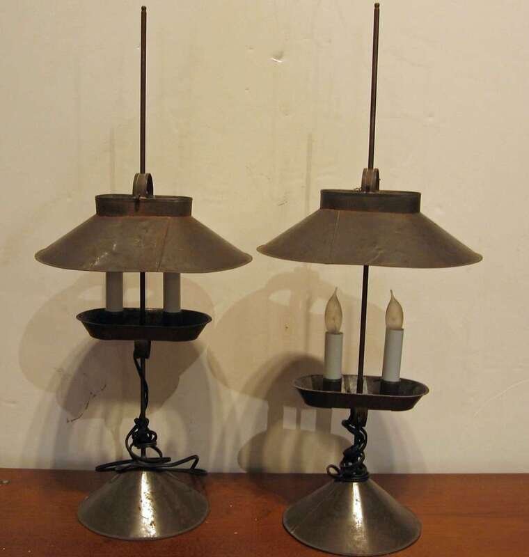Each with tall shaft and oval smoke shield above conforming dish fitted with two candles on a conical base, electrified.