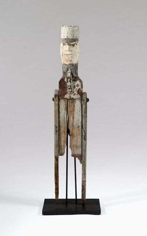 In the stylized form of a railroad engineer, with carved face, copper eyebrows, metal cap, collar and tie, weathered surface.