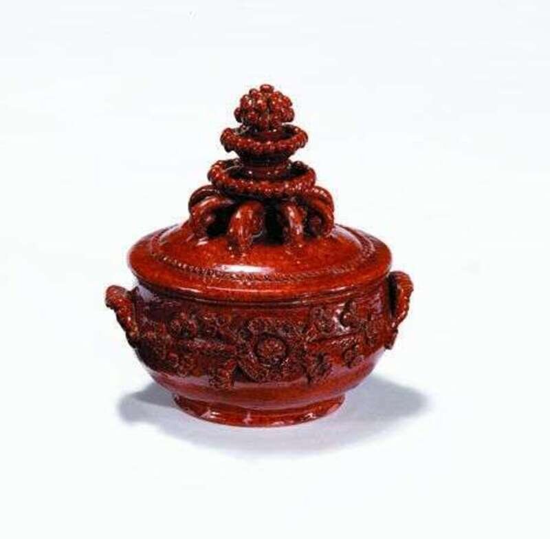 Covered glazed redware sugar bowl attributed to john nase, upper salford township, montgomery county, circa 1830