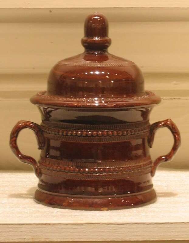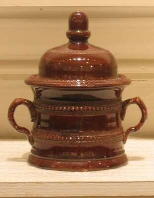 The acorn finial on domed lid, tapering cylidrical body, decorated with beaded bands, molded handles.