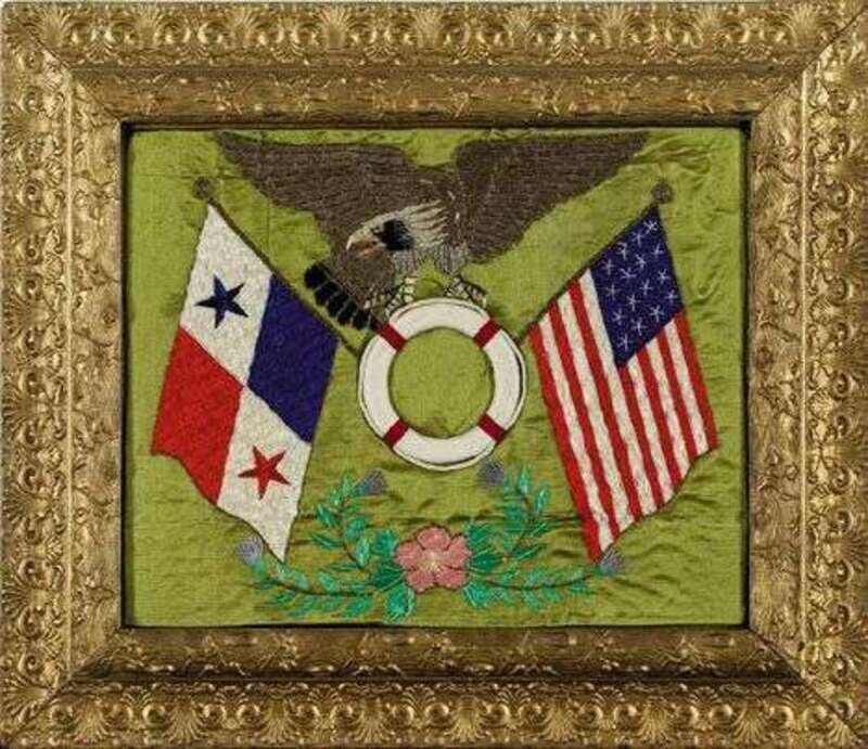 Life ring connects the flags of the United States and Panama, below an American eagle, silk and metallic threads on a silk ground, framed.