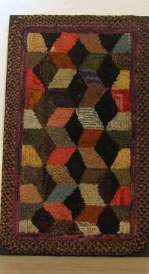 Rectangular form worked in a "Baby Block" patterrn with polychrome wool and cotton yarns within a braided border, mounted for hanging.