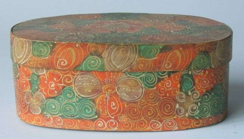 The oval form decorated with flowers and swirls in shades of red, green yellow, brown and white.
