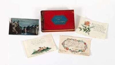 63 leaves loose in contemporary custom leather backed book-form box ; six leaves with original watercolor floral and other decorations, one watercolor view. Title given on front of box with owner's name, Friedrich Roth, on back.