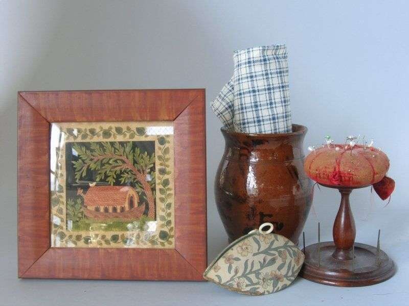 Including a Shaker Turned Cherry spool holder with pin cushion with printed paper label of Sabbathday Lake Shaker's Maine, a redware ovoid pot decorated with brown splotches, a length of blue and white check homespun cloth and a fabric sewing case, together with a hand colored Scherenschnitt of Noah's Ark, by C. J. Hopf of Salem, Massachusetts.