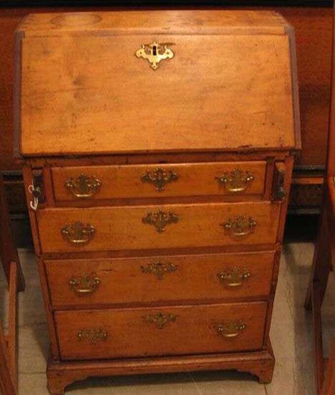 The molded slant top opens to fitted interior above four graduated lip-molded drawers, bracket base.