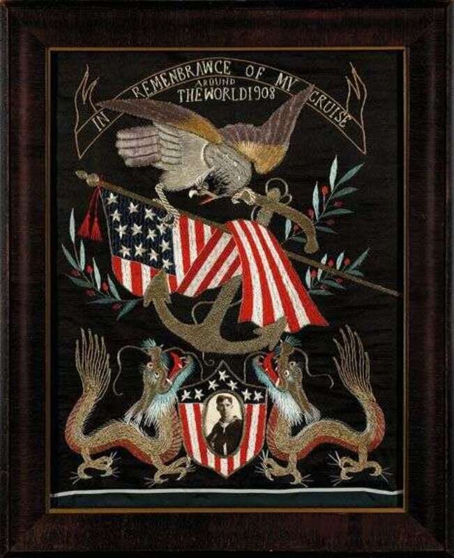 A bannerette inscribed "In Remembrawce [sic] of my cruise around the world 1908" above eagle with American flag and anchor and shield enclosing photograph of sailor, his hat band inscribed "U.S.S. Georgia," and flanked by dragons, embroidered with silk and metallic threads on a silk ground, framed.