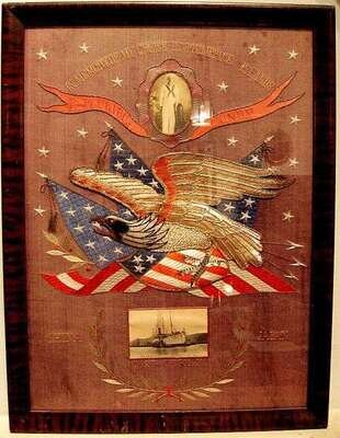 Embroidered, "In memory of my cruise of the Philippine Islands", "E Pluribus Unum", "China Japan", "USAT Sherman". Photographs of sailor and ship set in with embroidery needlework, silk and metallic threads.