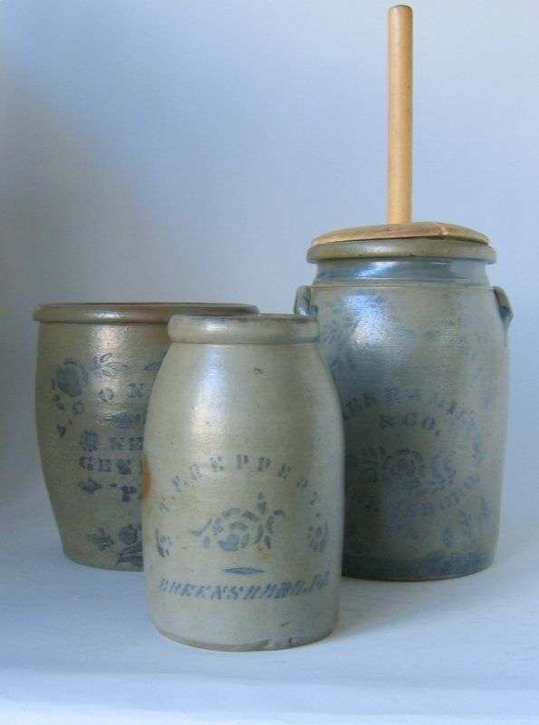 Including two crocks stenciled with roses, one with the name T.P. Reppert, the other with A. Conrad, and a churn decorated with roses and floral sprigs with the name James Hamilton & Co.