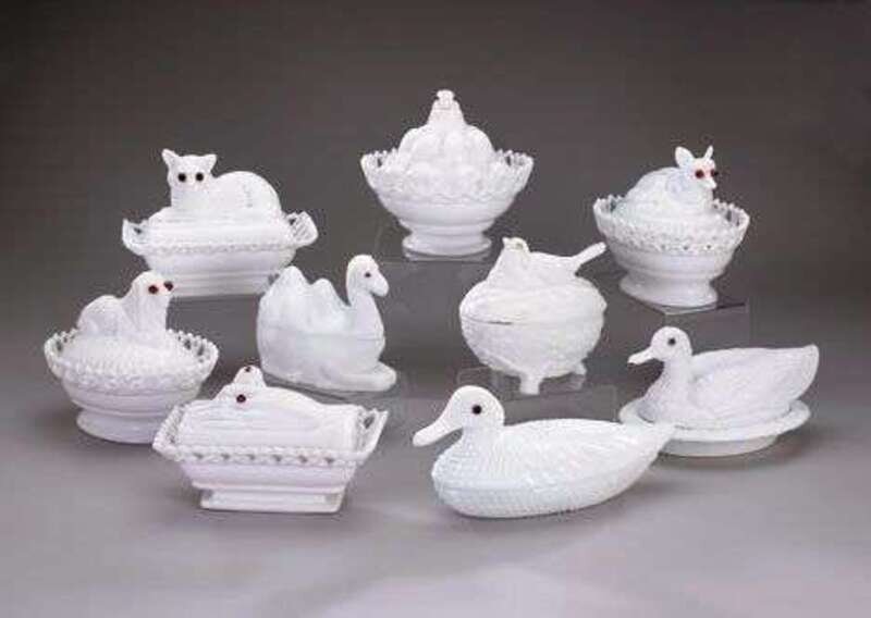 Five Milk glass covered dishes atterbury glass company, pittsburgh, pa. circa 1890