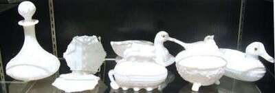 Including two star-form plates, a decanter, and figural covered dishes, a squirrel on an acorn, a duck on water, and a duck, a bird on a nest, some with colored glass eyes.