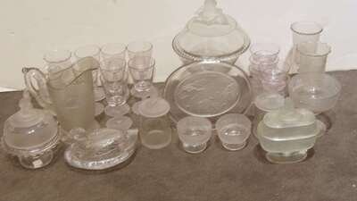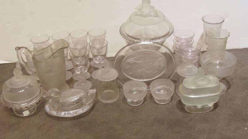 28 pieces of uncolored glass , including a compote, celery vase, six sauce dishes, seven goblets, and two marmalade jars in the Frosted Lion pattern; a platter, pitcher, celery vase, two sauce dishes, butter dish, two goblets, compote, and covered compote in Westward-Ho pattern, and an uncolored nesting duck form covered dish.
