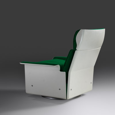 lacquered fiberglass, upholstery, plastic, matte chrome-plated steel