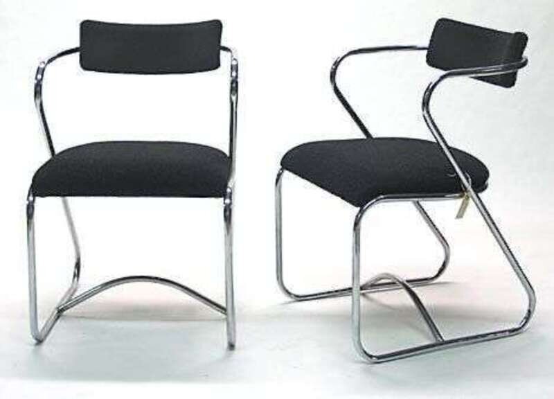 Gilbert Rhode pair of tubular chrome and charcoal upholstered open armchairs