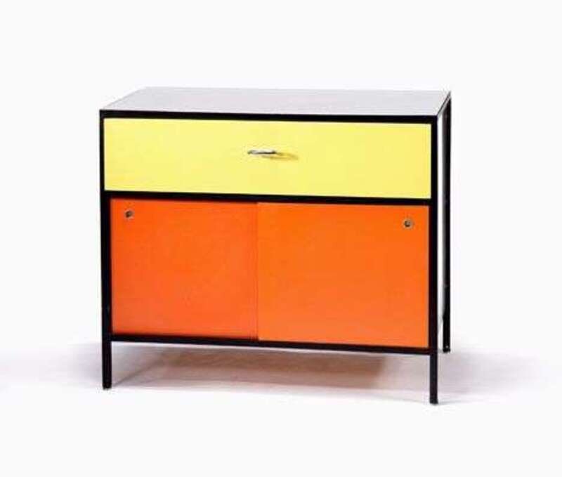 White, yellow and orange laminated cabinet fitted with single drawer and twin sliding doors.