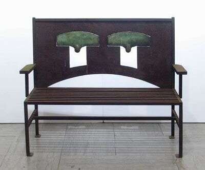 FRANK MORBILLO AMERICAN, 20TH CENTURY Open arm garden bench. Fabricated in cast bronze, slatted seat, straight crest rail, pierced bronze double back splat.