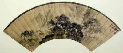 Signed, Handa Kofu Akihiko and with Handa seal. Sumi fan painting.